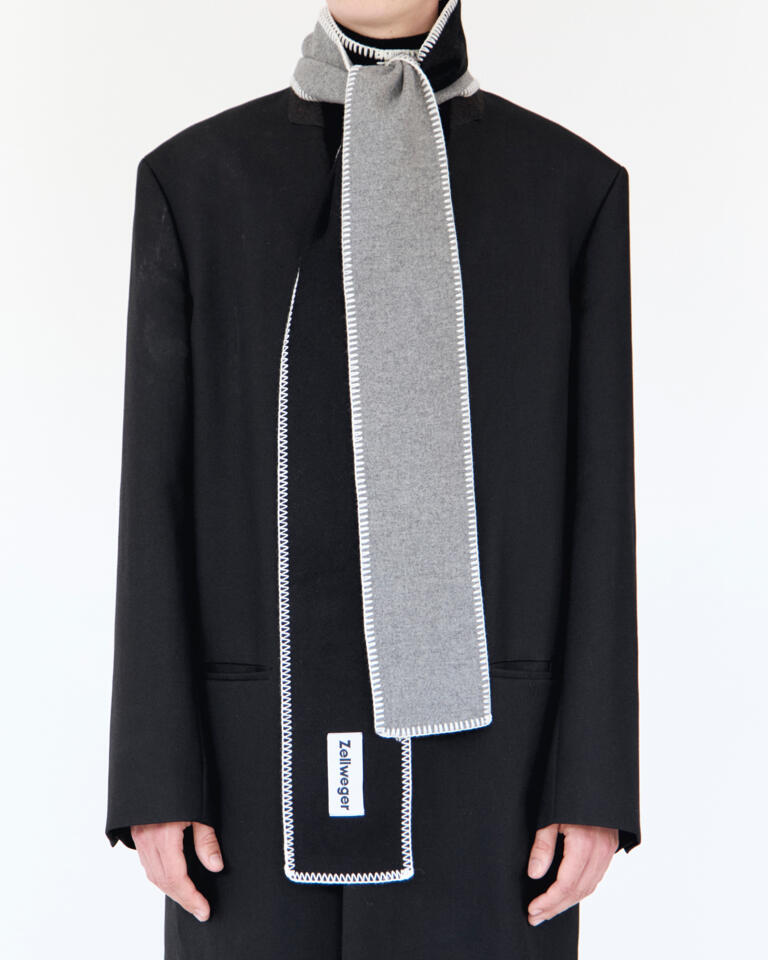 Two classic fabric meet in the style The Line in Deep Black - Stone Grey. With contrasting white stitching made from 100% Lana Wool, the long scarf wraps once (or twice) around the neck and elevates every look.