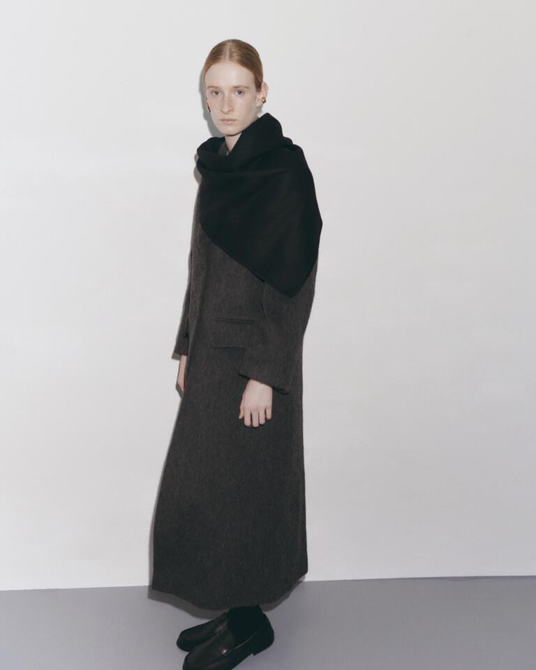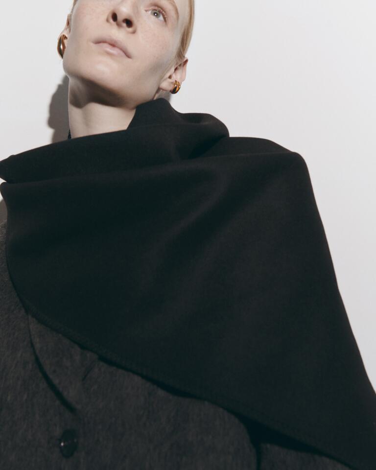 As a triangle, The Wrap has the ideal dimensions to be wrapped around the neck or worn as a cape over the shoulder. Made of 100% cashmere and in classic Deep Black with a matching overlock stitching.