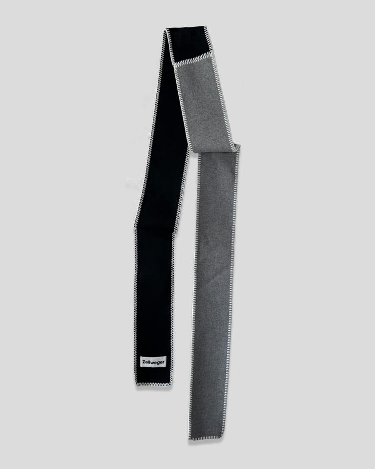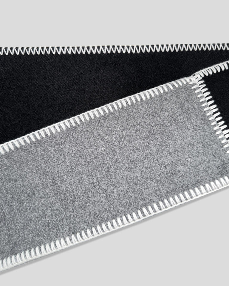 Two classic fabric meet in the style The Line in Deep Black - Stone Grey. With contrasting white stitching made from 100% Lana Wool, the long scarf wraps once (or twice) around the neck and elevates every look.