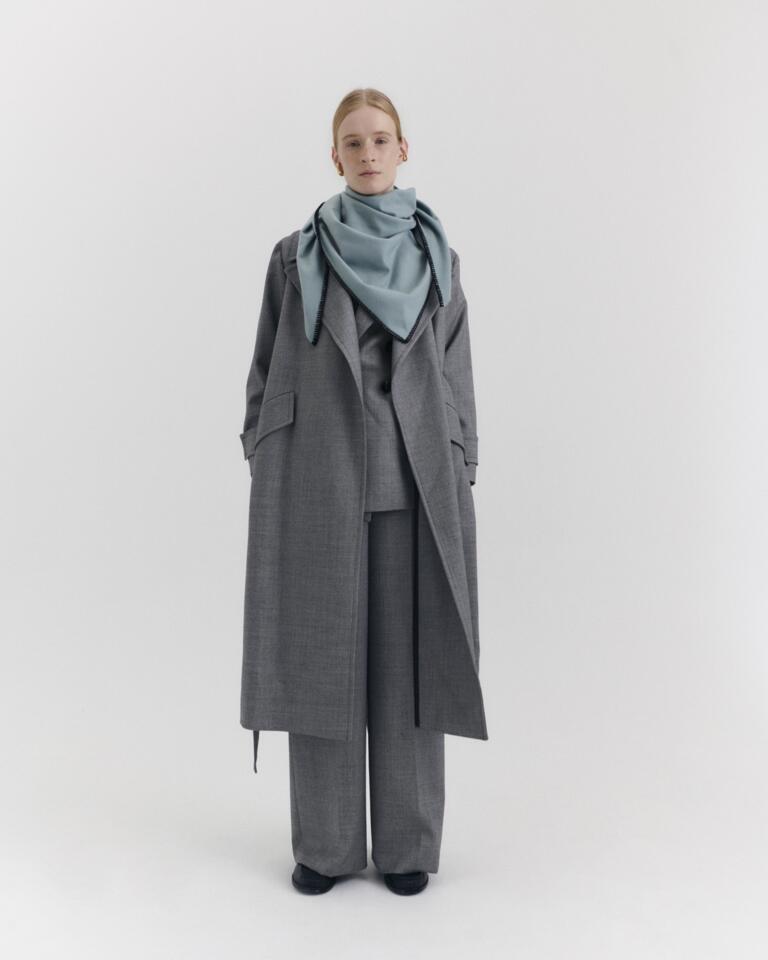 The Wrap in Sky Blue strikes with the contrasting overlock stitch in Deep Black. As a large triangle scarf around the neck, it unfolds its effect - as a style statement and a warming companion.